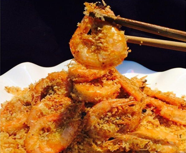 6.下提前煎熟的大虾,翻炒均匀至面包糠裹在大虾表面即可关火。