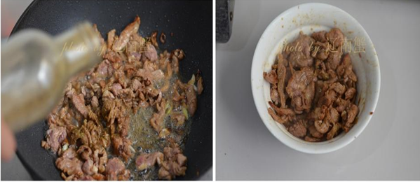 4、炒锅倒油,热锅凉油,将羊肉炒散。中间加入葱碎。