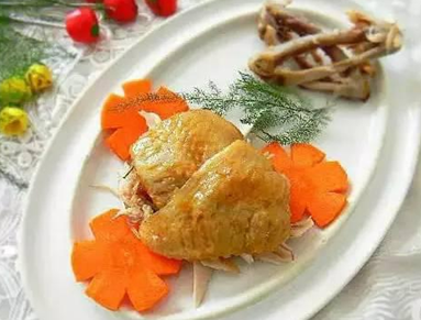 10. 我用胡萝卜刻成花朵状,装饰摆盘,肉丝上面盖上鸡翅中的外皮。