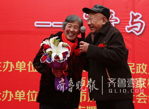 作为13对老夫妻中婚龄最长的一对,今年82岁的片振夏和77岁的马绪英老人已经结婚60年,是现场唯一一对钻石婚的老年夫妻。据两人介绍,他们当初是家里定的娃娃亲,现在已是四世同堂,全家共有23口人。“这一路走来很辛苦,但也很幸福。”说到两人60年携手走过的风风雨雨,马绪英老人介绍,当初,在电器开关厂退休以后,每月只有八十元的退休金,便做起了面条买卖,一边照顾孙子,一边补贴家用,直到孙子上了高中,才收起做了九年的生意。“孩子们都很孝顺,每周都回来看我们,他们各自的生活也很幸福,我们这一大家子都很祥和,我们老两口很知足。”马绪英老人高兴的表示。