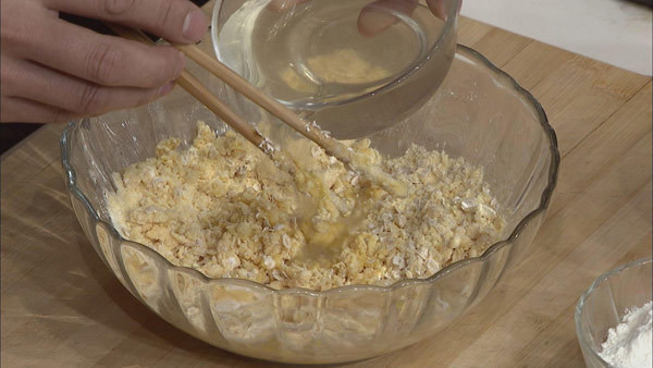 步骤1:将两份的玉米面,搭配一份的白面粉,再搭配一份的奶粉,加鸡蛋搅匀,再倒适量菊花水搅拌。