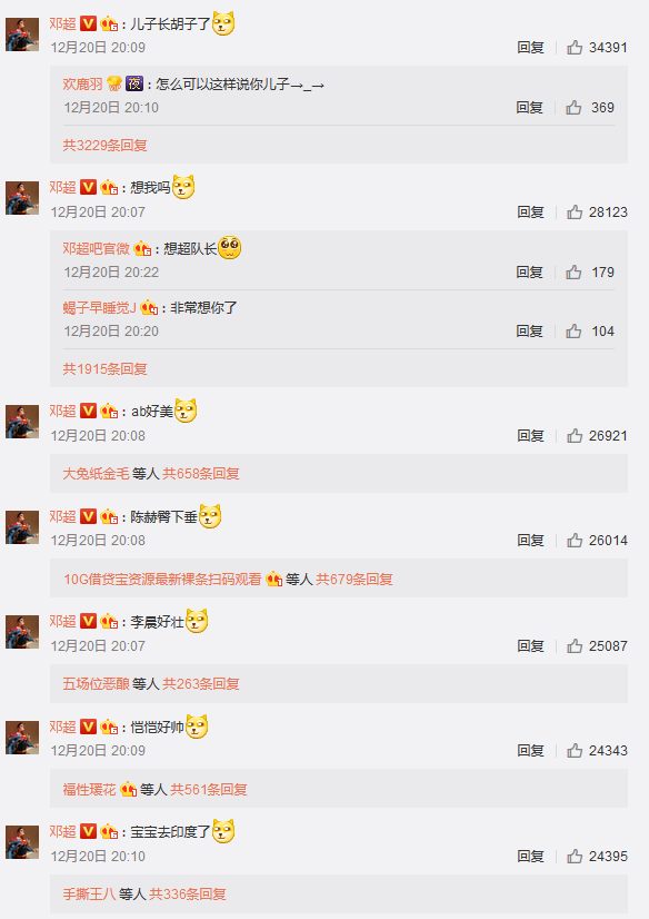 新浪娱乐讯 12月20日晚,邓超[微博]更博晒出《奔跑吧兄弟》三季成员们的合照,称:“想你们了~”他还在微博评论区刷屏回复,寄语每一位“跑男”成员:儿子(鹿晗[微博])长胡子了、ab好美、陈赫[微博]臀下垂、李晨[微博]好壮、恺恺好帅、祖蓝高了、宝宝去印度了、小包有头发了。如此深情款款,不仅让网友们高呼不懂超哥的套路,就连Angelababy在21日上午转发该微博时,都不免调侃道:“一直以为这条是高仿发的。”